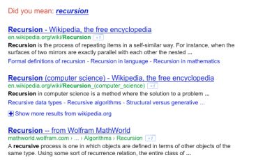 Google.com încearcă să vă fraierească un pic atunci când căutați Recursion. El încearcă să vă ducă în eroare și să credeți că ați scris greșit acest cuvând. Funcționează și în Google Translate.
