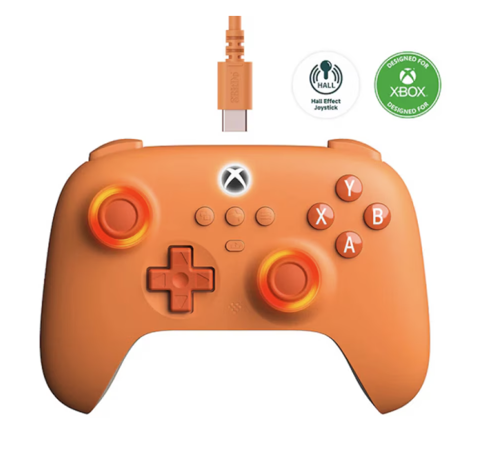 Am văzut multe controllere de la 8bitdo, iar recenziile sunt în general apreciative. Modelul de mai sus este conceput pentru Xbox / PC. Conexiunea se face prin fir, iar stick-urile și declanșatoarele sunt cu tehnologie Hall Effect. Iluminarea RGB este reglabilă – Fire Ring, Light-Tracing și Rainbow Ring.