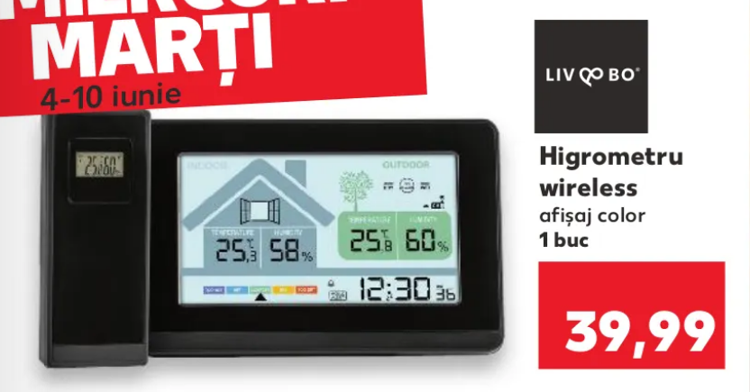 Liv&Bo este marcă proprie Kaufland, iar acest device ar trebui să măsoare umiditatea dintr-o încăpere (era mai interesant dacă avea mai mulţi sateliţi). Are şi ecran color, sună totuşi bine pentru cât costă (sper doar să facă şi ce trebuie).