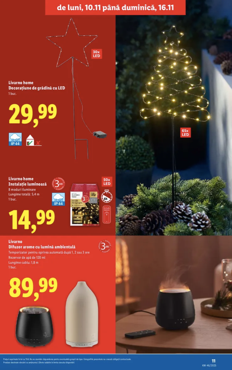 Difuzorul are oprire automată ce poate fi programată la 1, 2 sau 3 ore. Rezervorul de apă este de 120 ml, iar lungimea cablului este de 1.8 metri. Au adus și o decorațiune de grădină cu LED ce are certificare IP44 și 8 moduri de iluminare.