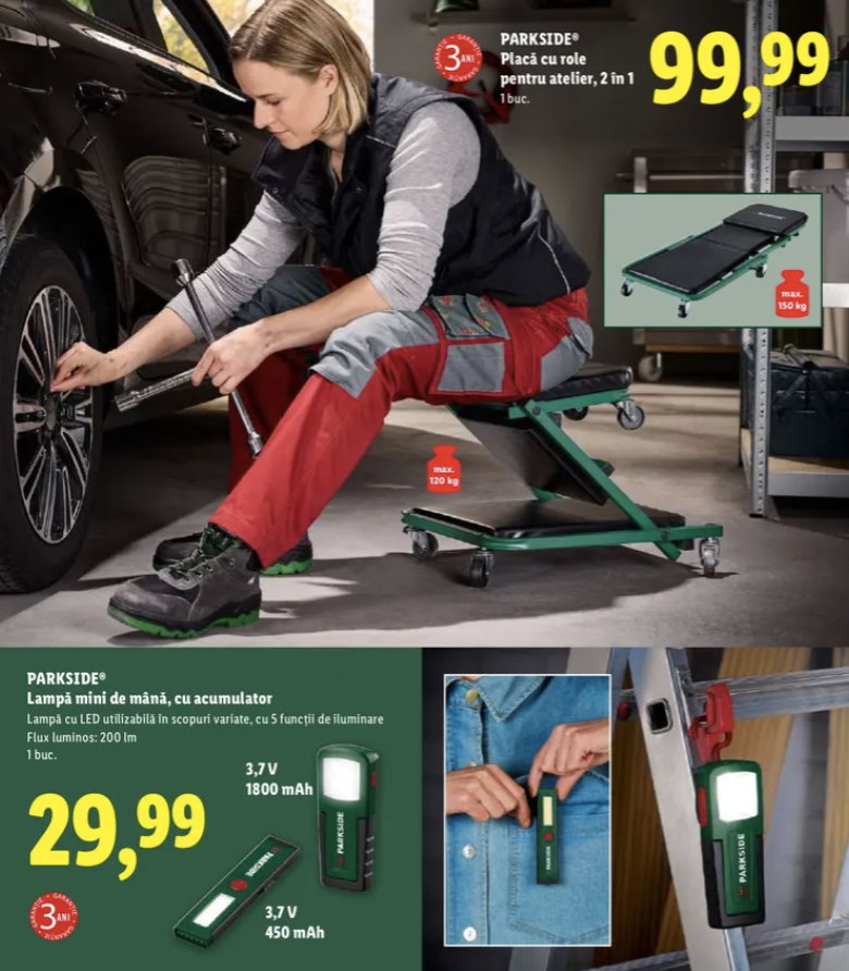 Lampa cu LED dispune de acumulator de 1800 mAh sau 450 mAh – în funcție de varianta aleasă, 5 funcții de iluminare și garanție pe 3 ani. Mai este și o palcă cu role pentru atelier.
