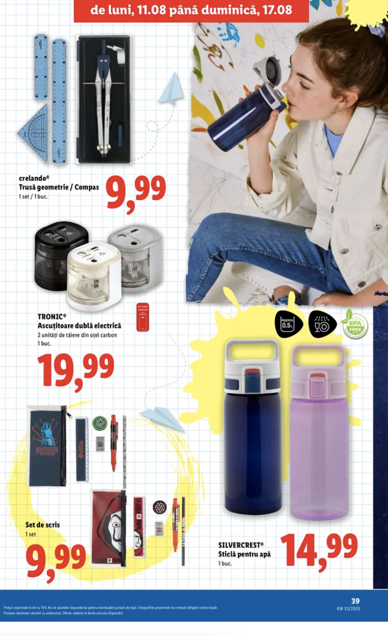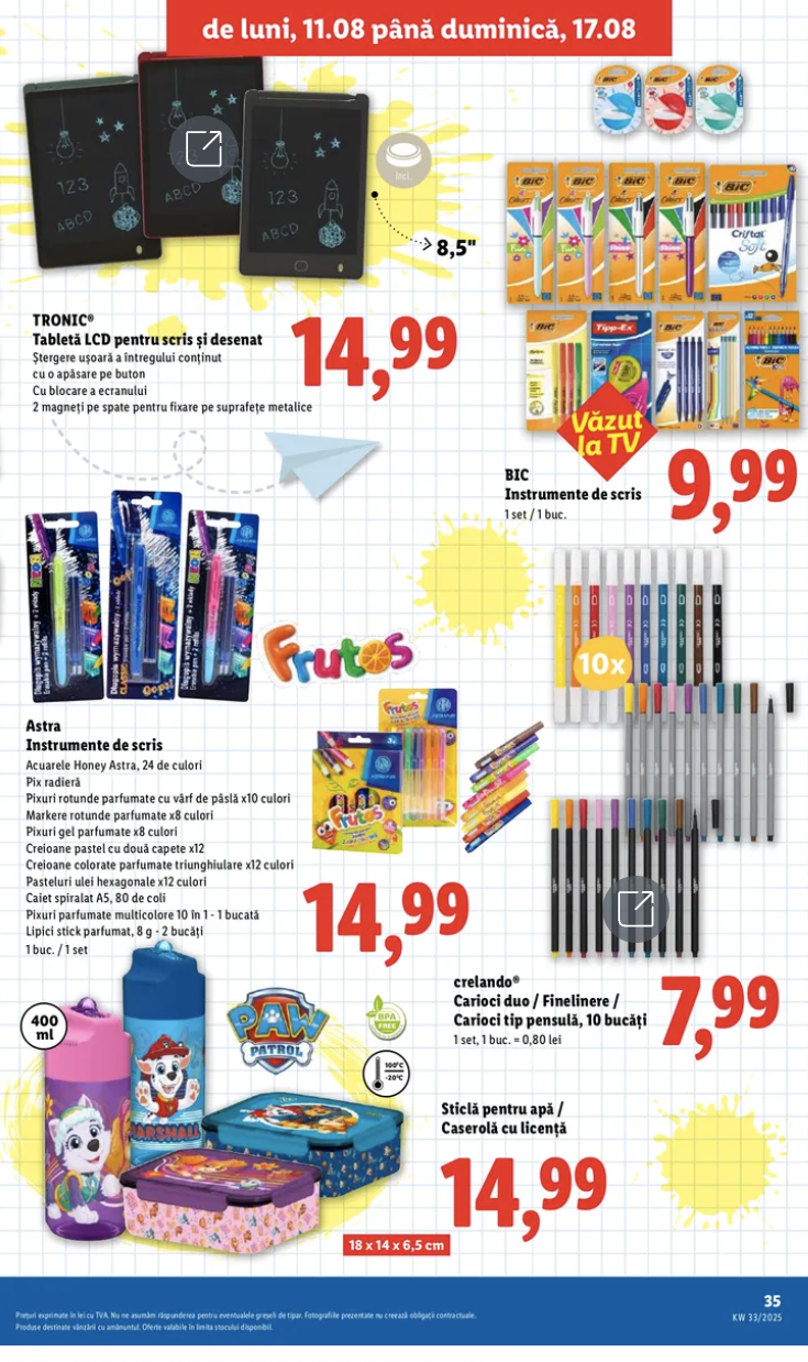 LIDL iese în față cu prețuri atractive pentru rechizitele listate. Pe lângă o tabletă LCD pentru scris și desenat mai sunt instrumente de scris, sticlă pentru apă / caserolă, carioci, instrumente de scris de la BIC etc.