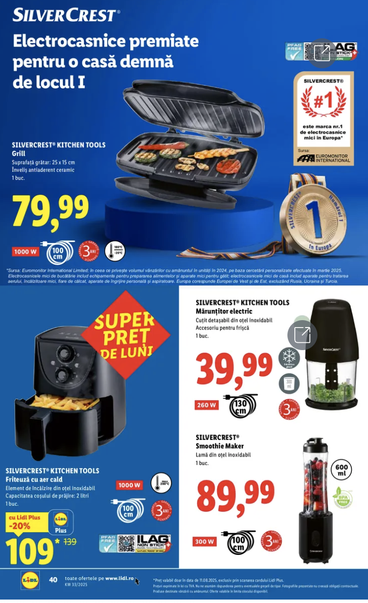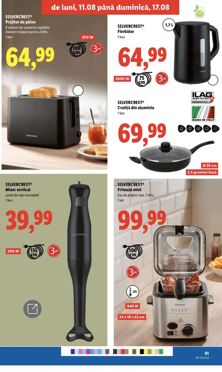 Au listat și un prăjitor de pâine cu 6 niveluri de rumenire dintre care puteți selecta, fierbător de apă, mixer vertical și fritueză mini. Toate fac parte din portofoliul Silvercrest, brand al LIDL.