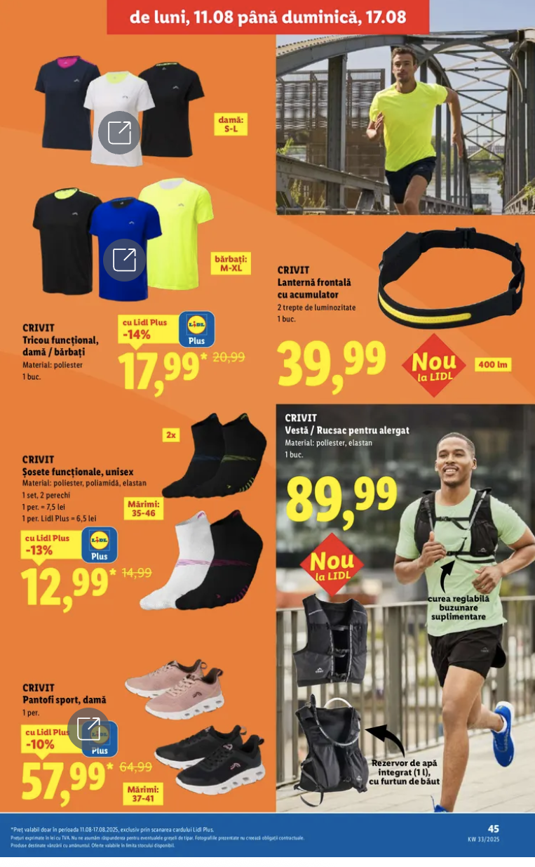 Lanterna frontală cu acumulator are 2 trepte de luminozitate, iar vesta sau rucsacul pentru alergat au rezervor integrat cu furtun, capacitate de 1 litru.