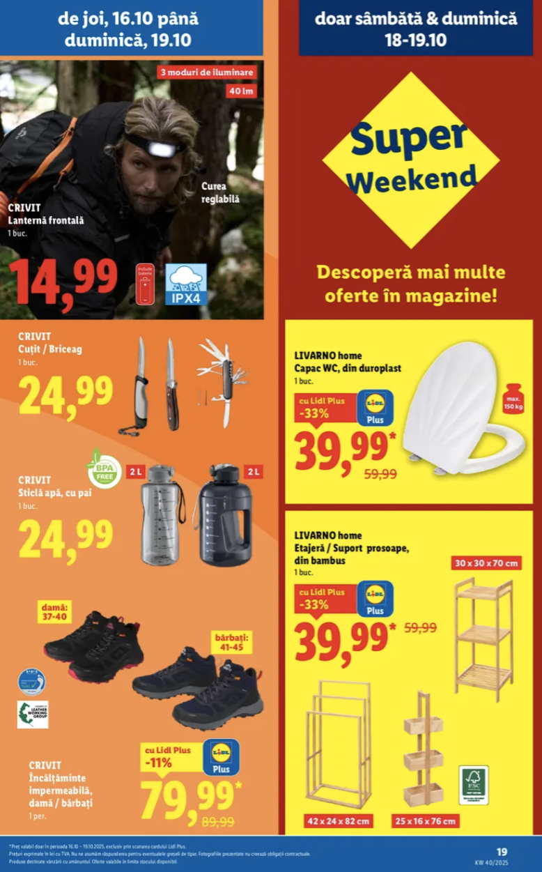 Găsiți de la încălțăminte impermeabilă la 79.99 lei și până la sticle de apă cu capacitatea de 2 litri, lanternă LED frontală și altele.