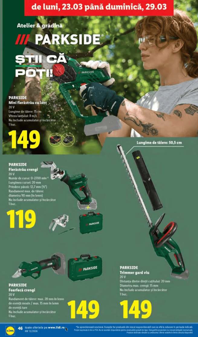 Drujba Parkside are motor în 2 timpi de 2.7 CP / 2kW, frână antirecul, lungimea de tăiere este de 44 cm, iar capacitatea sa cilindrică este de 53 cm cubi. Mai găsiți listat și un aparat de curățat cu presiune cu consum maxim de energie de 1400W, presiune maximă de 110 bari și debit de 6.5 litri pe minut, un trimmer de gard viu și un motofierăstrău electric cu lungime de tăiere de 34 cm.
