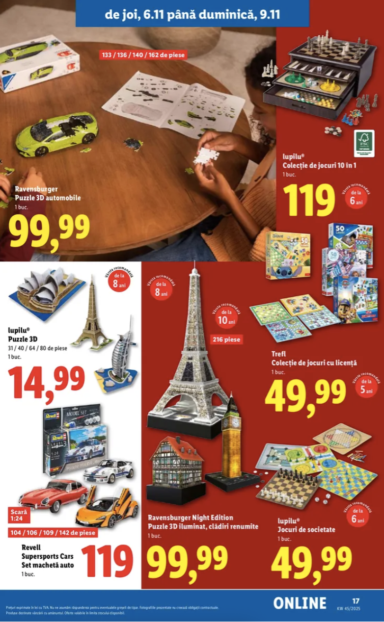 Veți descoperi de la machetă auto, puzzle 3D iluminat cu clădiri renumite, jocuri de societate, colecție de jocuri 10-in 1 și până la puzzle 3D cu automobile.