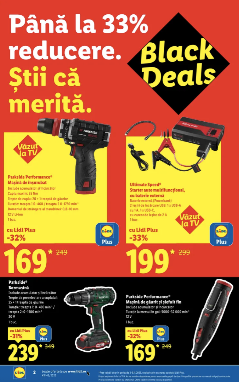 Au adus de în sesiunea de promoții denumită generic Black Deals se află de la o bormașină Parkside cu acumulator și până la un start auto multifuncțional cu baterie externă de tip powerbank – 2 ieșiri de încărcare pe USB-A și USB-C, curent de ieșire la 2A.