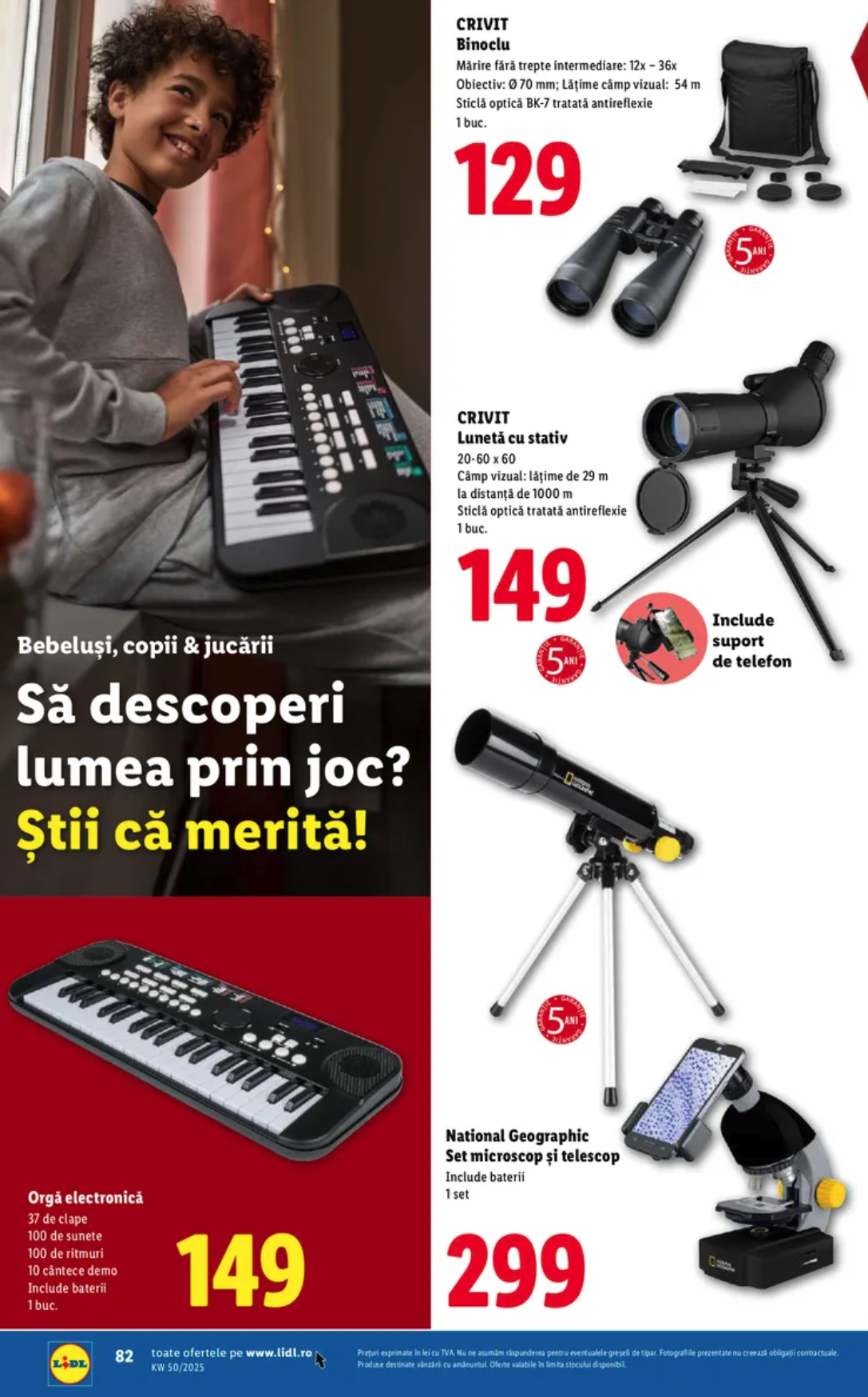 Bonul poate fi înregistrat în aplicația LIDL Plus spre a avea la îndemână garanția (Android / iOS), mai ales că unele produse au până la 5 ani garanție. Setul de microscop și telescop include bateriile necesare, iar orga electronică are 37 de clape, 100 de sunete și 100 de ritmuri, dar și 10 cântece demo. Luneta cu stativ include suport de telefon.