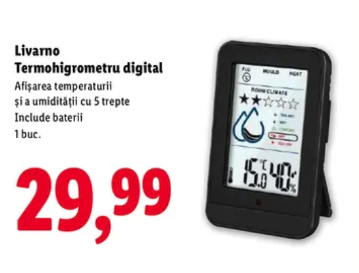 Funcționează pe baterii și ar putea fi de ajutor, mai ales pe timp de iarnă. Ai informații atât despre temperatura din locuință, dar și despre umiditate.