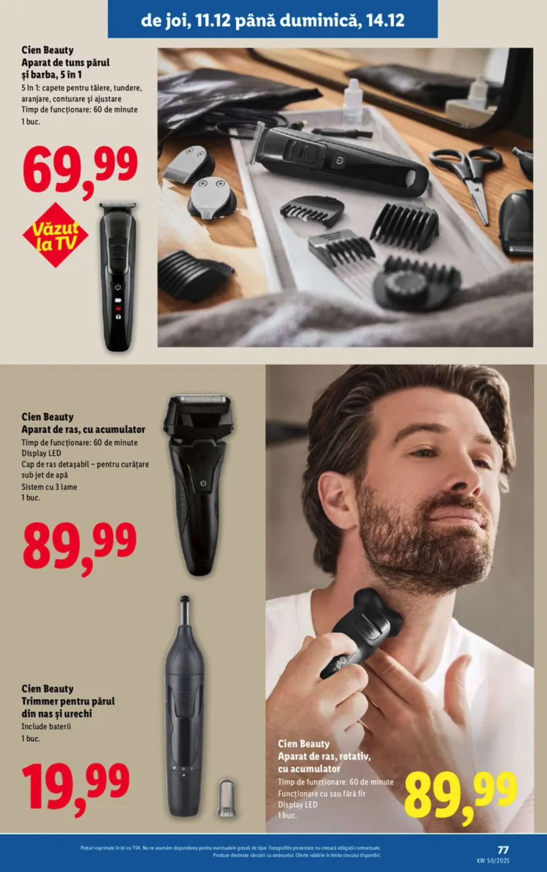 Găsiți un aparat de ras cu acumulator, un trimmer pentru părul din nas și urechi, un alt aparat de ras cu autonomie de 60 minute și cap de ras detașabil spre a fi curățat sub jet de apă, dar și un aparat de tuns părul multifuncțional.