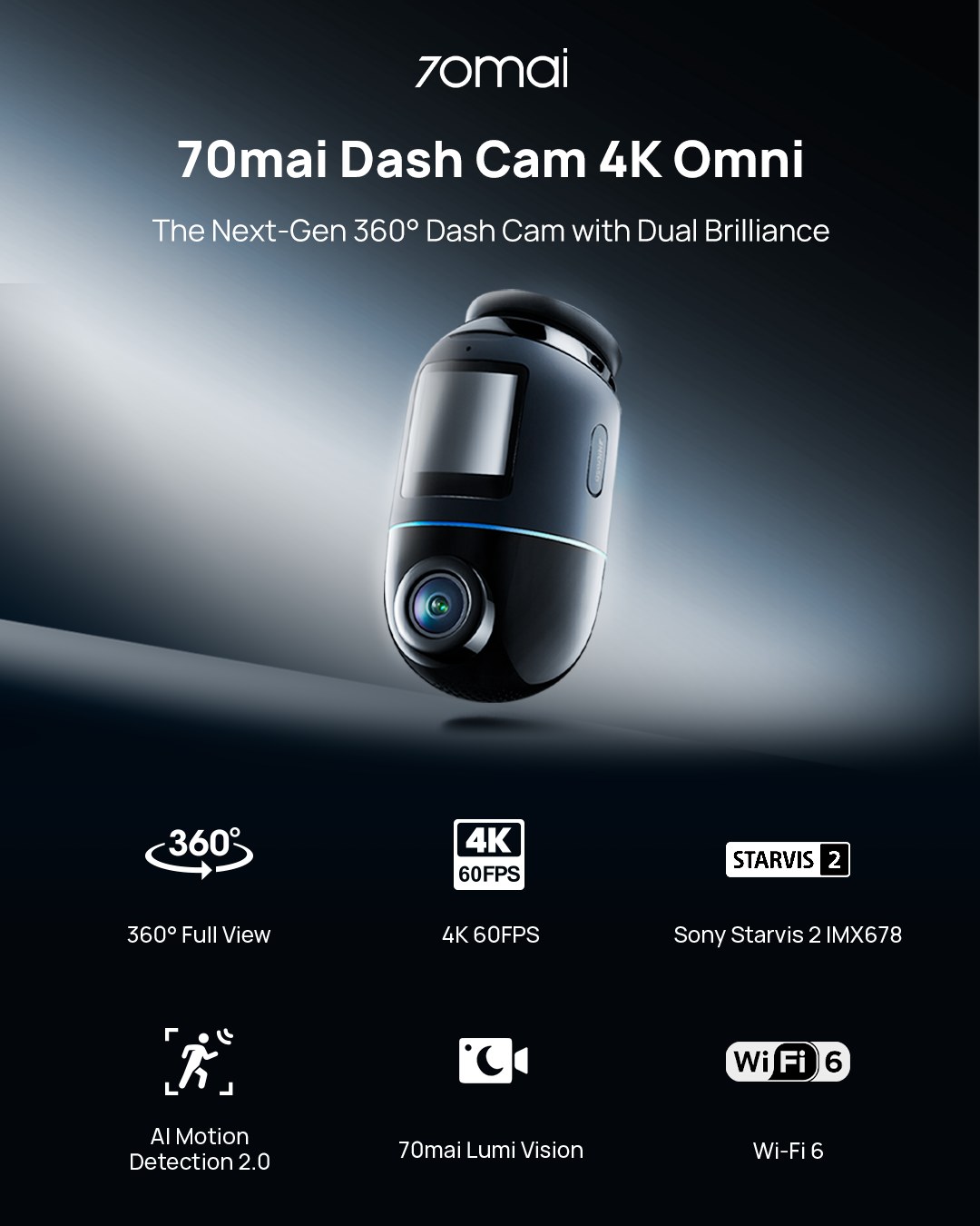 🔵 70mai Omni 4K incluse un senzor Sony STARVIS 2 IMX678 cu înregistrare duală HDR pe față și spate, detecție inteligentă a mișcării 2.0, compatibilitate cu conexiunea de date 4G pentru monitorizare de la distanță, Wi-Fi 6, filmează 4K cu până la 60 fps, iar senzorul se rotește la 360 de grade;