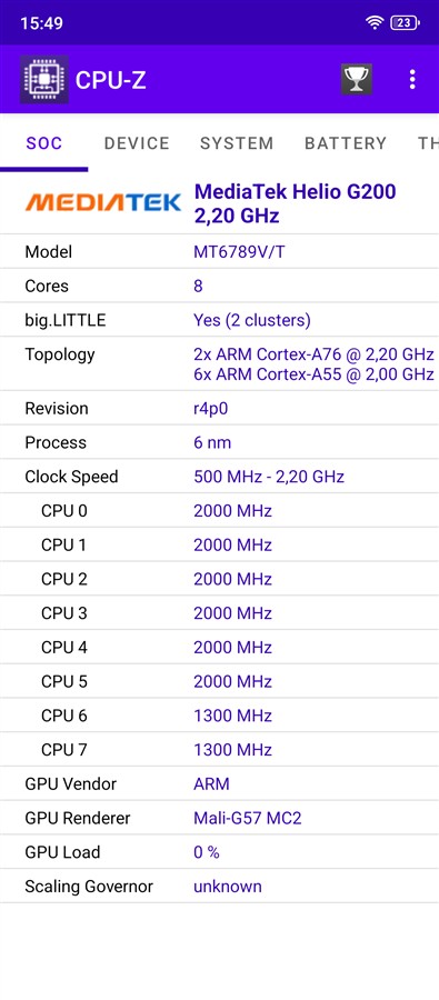 | Procesor | MediaTek MT 6789 Helio G200 dezvoltat pe 6nm, octa-core cu 2 x ARM Cortex-A76 la 2.2 GHz + 2 x ARM Cortex-A55 la 2.0 GHz |