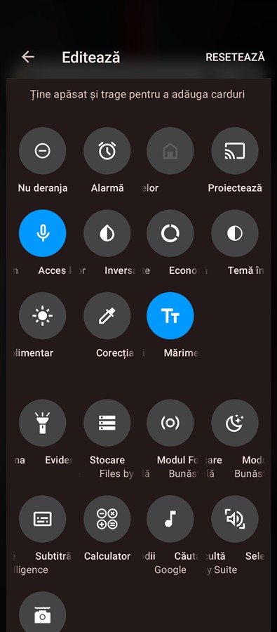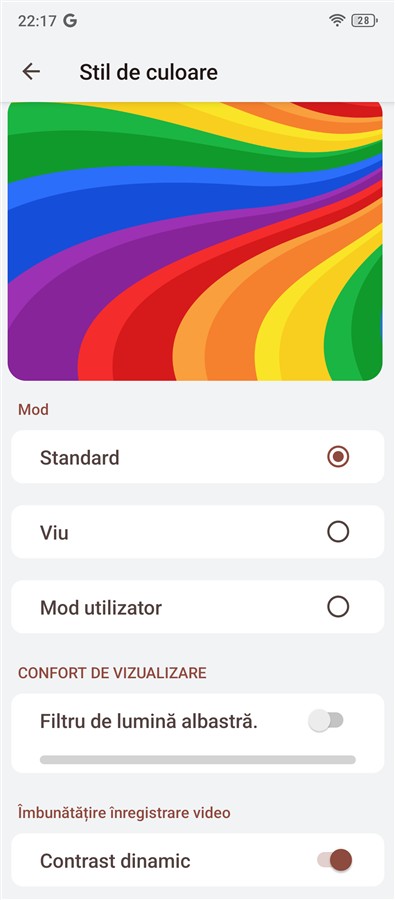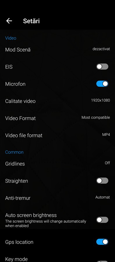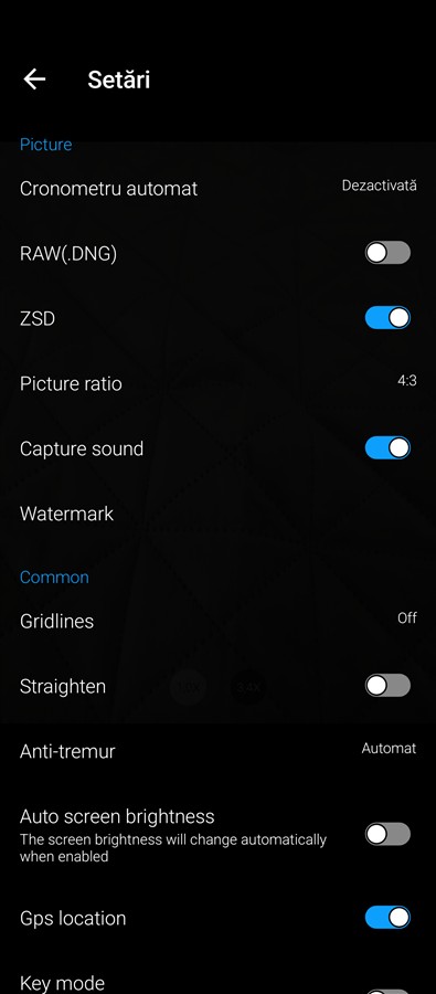 Observăm o abordare minimalistă pe ecranele de captură, în sensul că opțiunile pentru fiecare mod sunt puse într-un meniu dedicat cu setări, fără setări rapide accesibile prin gesturile clasice – swipe de sus în jos sau invers. Totodată, mai vedem că traducerea modurilor și a altor cuvinte nu este cea mai fericită – Fotografierea, Casetă video, Profesioniști etc, iar asta este valabil, de altfel, nu doar în aplicația Camera, ci și prin interfața sistemului de operare.