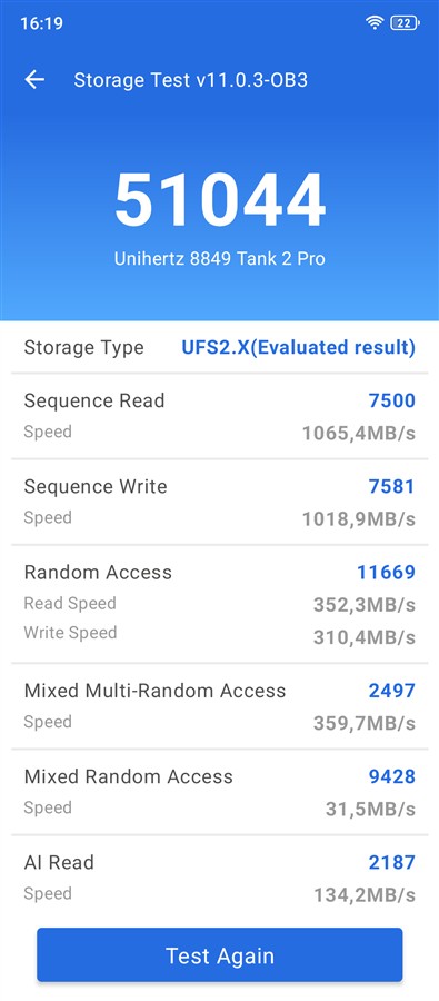 | AnTuTu Storage Test Citire secvențială Scriere secvențială | 51044 puncte 1065.4 MB/s 1018.9 MB/s |