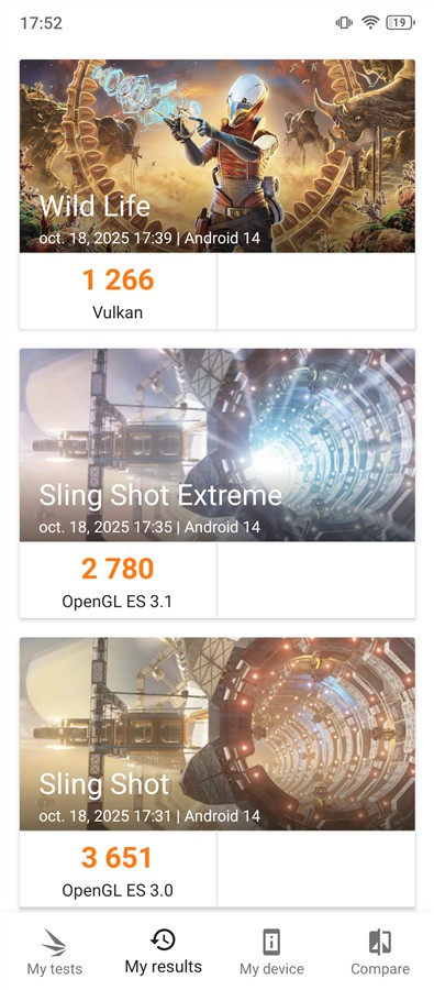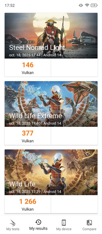 | 3DMark Steel Nomad Light Wild Life Vulkan Wild Life Extreme Vulkan Sling Shot OpenGL ES 3.0 Sling Shot Extreme OpenGL ES 3.1 | 146 puncte 1266 puncte 377 puncte 3651 puncte 2780 puncte |