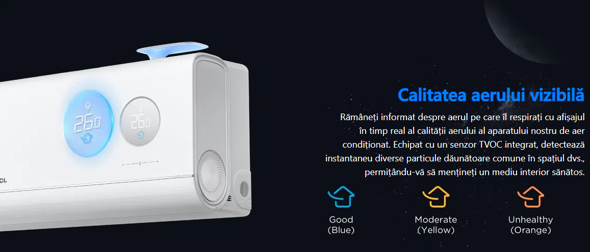 TCL TAC-12CHSD/FCI este echipat și cu un senzor TVOC, care detectează calitatea aerului din interior, iar dacă aceasta este neconformă atunci te avertizează prin modul de iluminare al ecranului de pe unitatea interioară – albastru dacă totul este bine, galben dacă aerul are o calitate medie și portocaliu pentru o calitate a aerului nesănătoasă.
