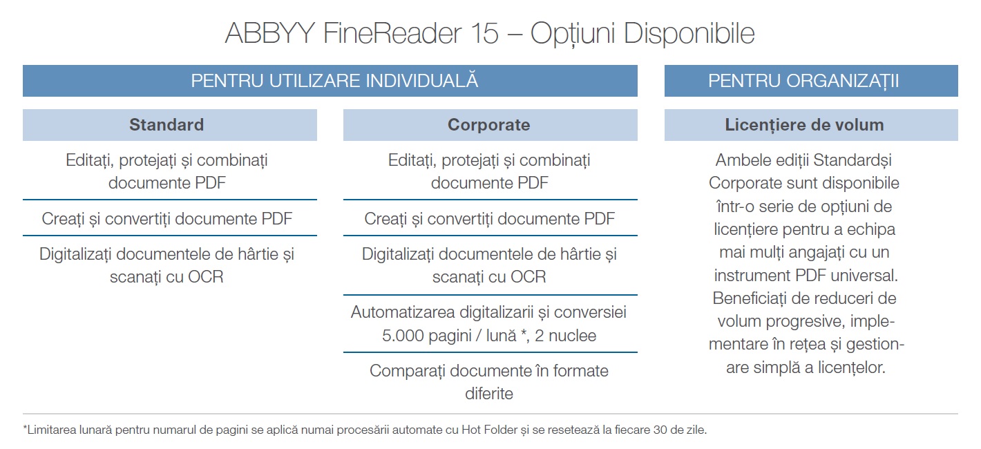 Opțiunile disponibile în fiecare variantă de ABBY FineReader 15 le puteți descoperi în imaginea de mai jos: