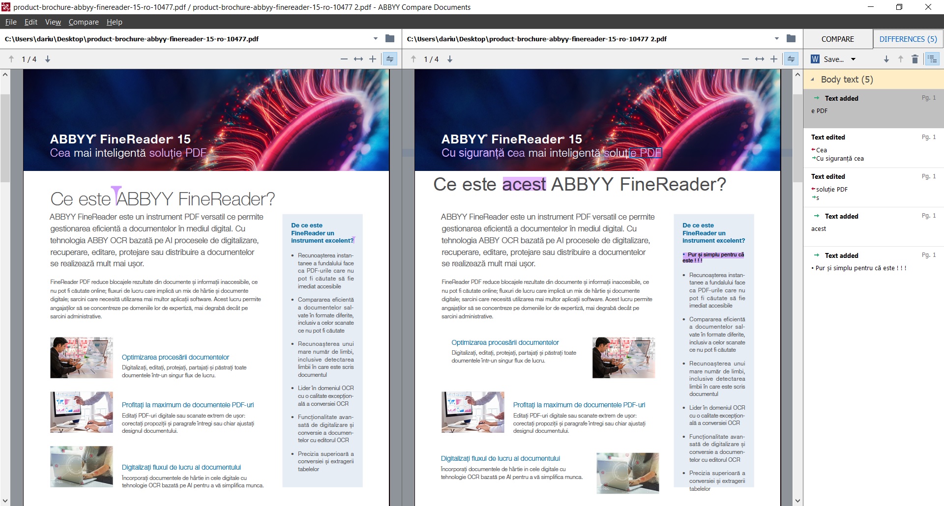 Interfața de comparare documente și exemple de comparații între documente cu diferențele dintre ele găsite automat de ABBYY FineReader 15 Corporate: