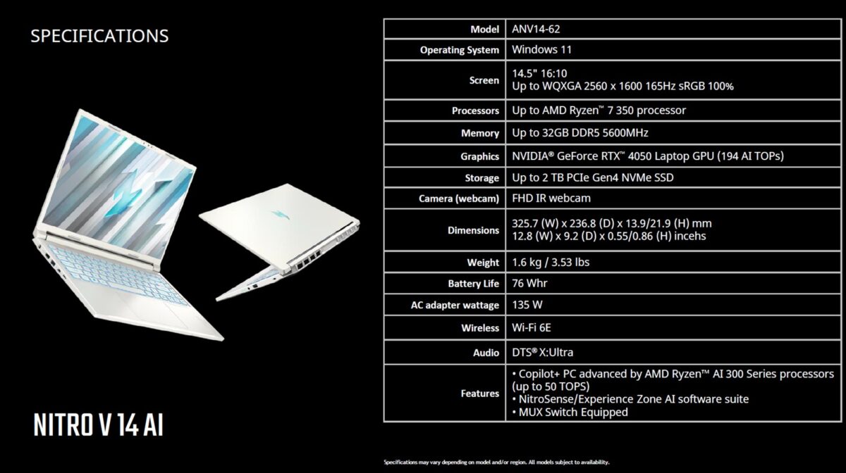 Pentru gamerii care nu au bugete serioase la dispoziție, Acer a prezentat Nitro V14 AI și Nitro V15, care afișează specificații mai mult decât decente și pe care le puteți parcurge din imaginile următoare: