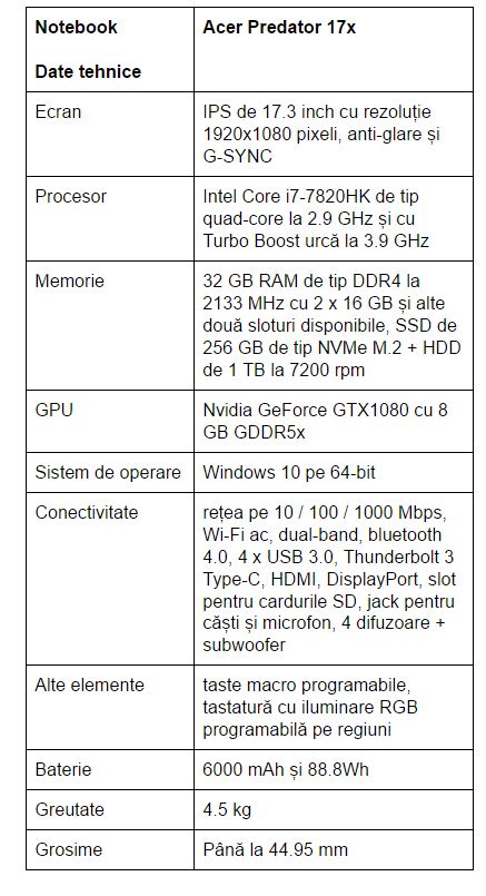 Acer Predator 17x – 12699 lei la evoMAG, dar afișat cu mențiunea Stoc epuizat la momentul în care public review-ul. Configurația are specificațiile unității testate, cu excepția cantității de memorie RAM – 16 GB vs 32 la 17x-ul cu care m-am jucat.