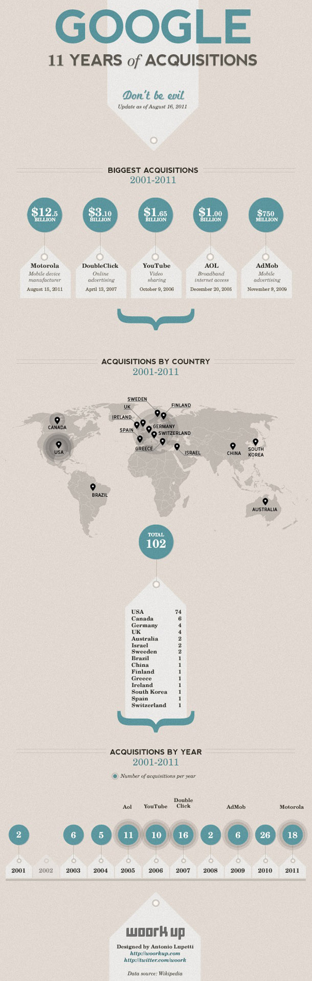 Compania americană a făcut achiziții în mod continuu în ultima decadă. Tocmai ce am dat de un infografic care le prezintă pe cele mai importante. Cea mai scumpă dintre ele este Motorola pentru 12.5 miliarde dolari. Va intra în vigoare dacă va trece de avizul instituțiilor americane și abia din 2012 vom vedea telefoane Motorola sub conducerea directă a Google.