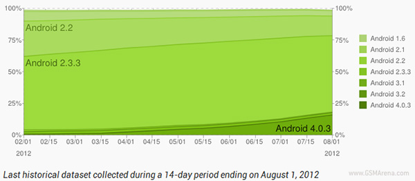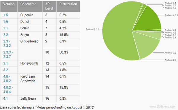 Se pare că supremaţia lui Android 2.3 Gingerbread începe să scadă, ajungând de la 64% în luna iunie, la puţin peste 60% în luna iulie. Procentul destul de ridicat de 60,6% explică faptul că sunt încă o mulţime de device-uri blocate la acest nivel, în special datorită capacităţii hardware scăzute, dar mai ales datorită nepăsării unor companii care în lupta lor de a vinde cât mai multe terminale noi, uită de cele vechi şi le condamnă la pieire. Ba mai mult, încă 15,5% din device-urile cu Android utilizează versiunea Froyo, o versiune veche şi necompetitivă. Singurul lucru îmbucurător este dublarea numărului de terminale cu Android 4.0 Ice Cream Sandwich.
