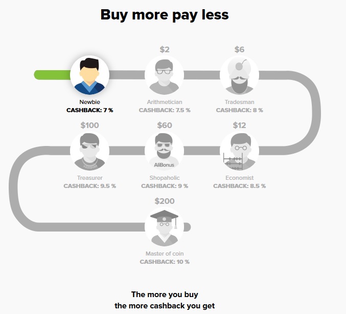 Exemplu: Prima dată achiziţionaţi un smartwatch de 35 dolari. La acesta veţi primi înapoi 7%, adică 2.45 dolari. Data următoare vă cumpăraţi o baterie externă de 30 dolari. La aceasta veţi primi înapoi 7.5% (vă încadraţi între 2-6 dolari de la prima achiziţie), adică 2.25 dolari. Procesul continuă astfel până ajungeţi la o valoare totală de 200 dolari cashback. După aceasta la orice achiziţie primiţi înapoi 10%.