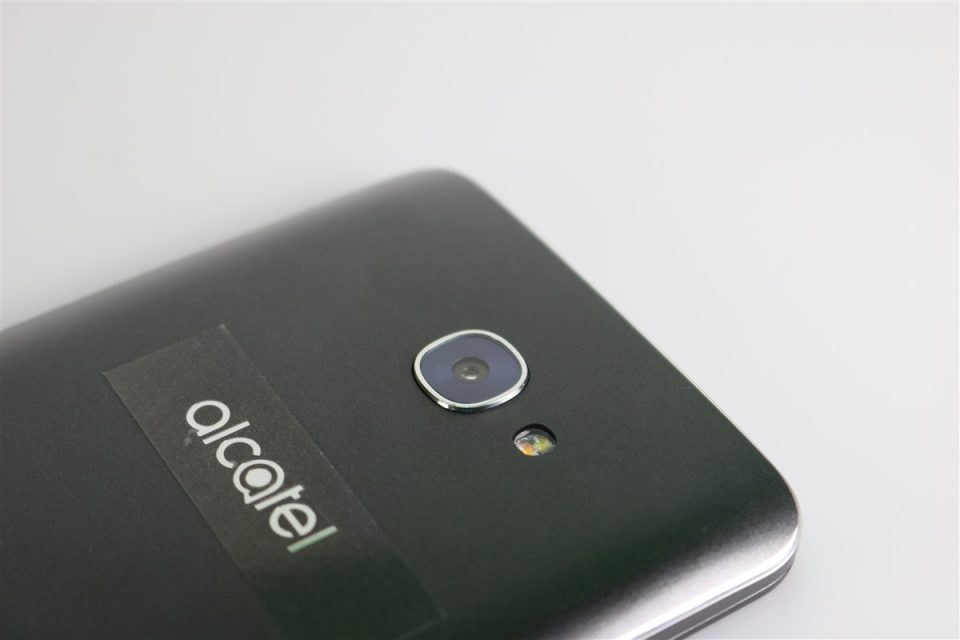 În partea frontală se remarcă cititorul de amprentă încorporat în tasta fizică centrală, metodă utilizată în mod special de către Samsung pe smartphone-urile, în aceeași zonă găsim și două taste capacitive cu rol de Back în stânga și Aplicații recente, în dreapta tastei fizice menționate. Logo-ul Alcatel lipsește în partea frontală, a fost adus la scară mare pe partea spate.