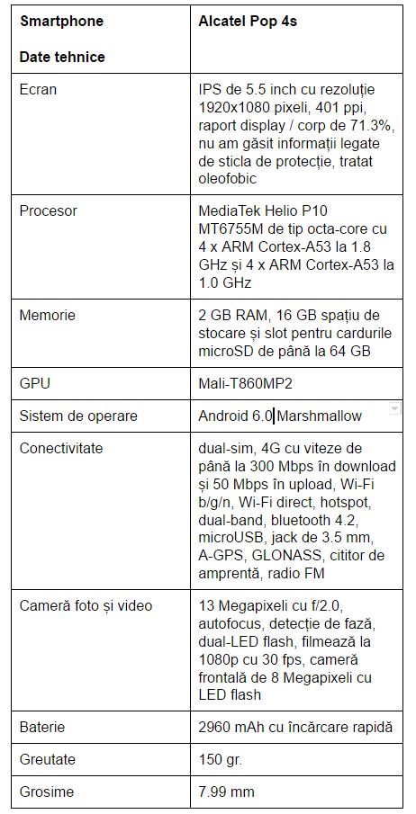 Alcatel Pop 4s este un alt smartphone poziționat destul de sus ca preț, pentru ceea ce oferă. Pe la 700 – 750 lei l-aș considera a fi recomandat. Pe la 900 lei aș spune că sunt alternative mai bune. Are și puncte PRO, dar și destul de multe elemente care nu-l recomandă.