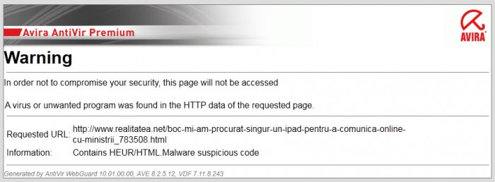 Alerta apare în momentul accesării oricărui articol de pe prima pagină. AVG si Avira nu au raportat nimic suspect pe prima pagina, doar în subpagini.