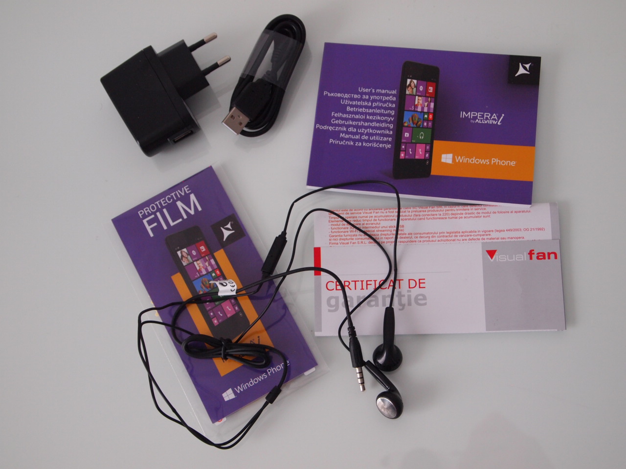 În cutia primită la test, am găsit alături de smartphone și bateria, încărcătorul, cablul microUSB – USB 2.0, căști, folie de protecție pentru ecran, manual de utilizare și certificat de garanție.