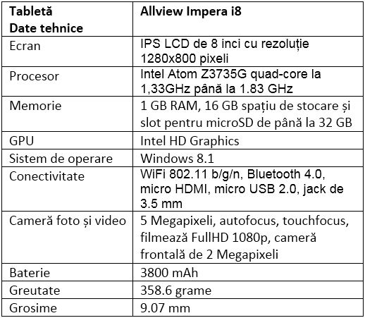 Allview Impera i8 se bazează pe serviciile unui procesor quad-core Intel Atom Z3735G, cu frecvența la 1,33 GHz ce poate urca până la 1.83 GHz. Acceleratorul grafic este un Intel HD Graphics, care alături de 1 GB de RAM se descurcă decent în jocuri. Spațiul de stocare de 16 GB este suficient pentru o tabletă cu Android, dar pentru Windows 8.1 este total neadecvat. Un card microSD de cel puțin încă 16 GB este imperios necesar.