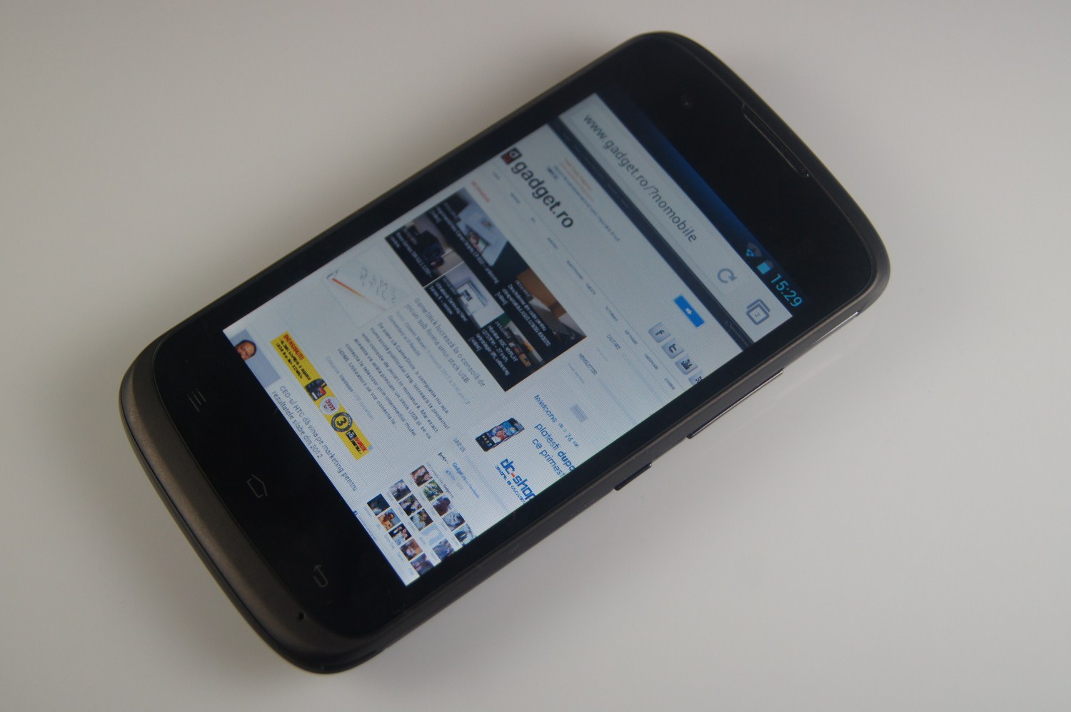 Sunt câteva valori de luat în seamă: display de 3.95 inch, 162 gr. și 11.5 mm. Rezultă un smartphone cu greutate, nu-i un device slim. Acesta ar fi singurul compromis, nu uitați de prețul afișat care-l transformă în best buy. Materialele folosite și asamblarea sunt decente, de la bine în sus. Se simte bine în mână, ușor de utilizat. Tasta de power și cea pentru reglarea volumului sunt frumos integrate pe lateral în designul smartphone-ului. Sunt două muchii metalice ce atrag atenția. Strâns în mână nu scoate vreun sunet ciudat și aș risca să spun că este cel mai bine închegat smartphone de sub 1000 de lei.