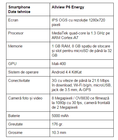 Mai adaug aici faptul că, deși capacul spate poate fi îndepărtat, bateria este fixă și nu poate fi scoasă din locașul ei. De asemenea, merită menționat că Allview P6 Energy poate acționa ca un power bank (baterie auxiliară, externă) pentru un alt telefon sau poate chiar tabletă. Pentru asta este nevoie de un cablu microUSB – USB OTG, neinclus în pachet.