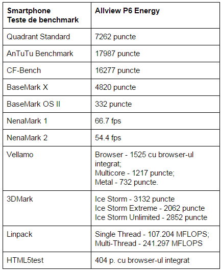 Toate rezultatele din testele de benchmark prin care a trecut Allview P6 Energy sunt reunite în tabelul de mai jos: