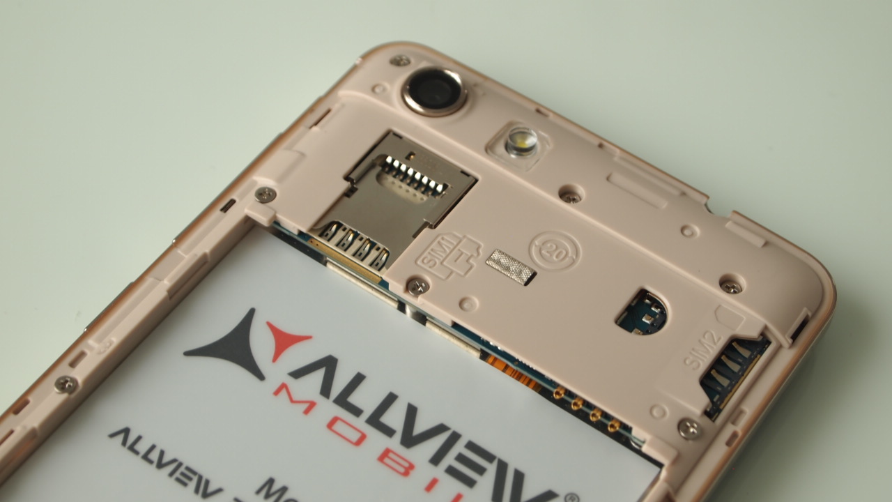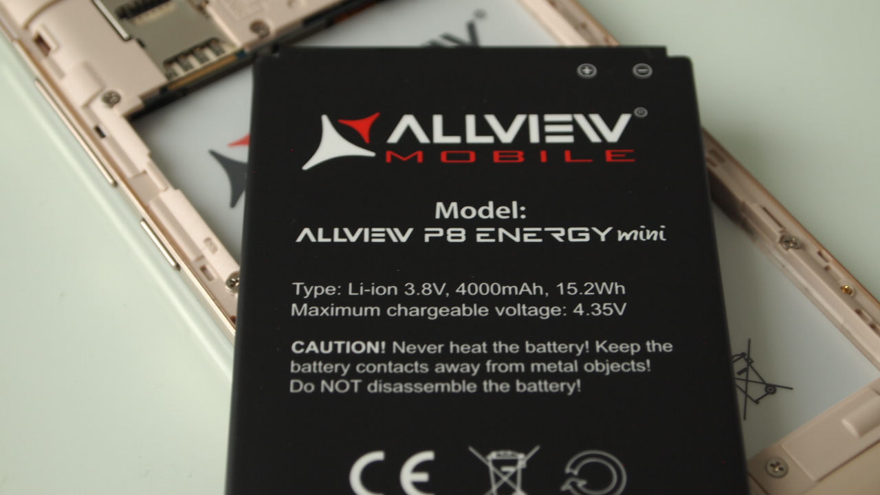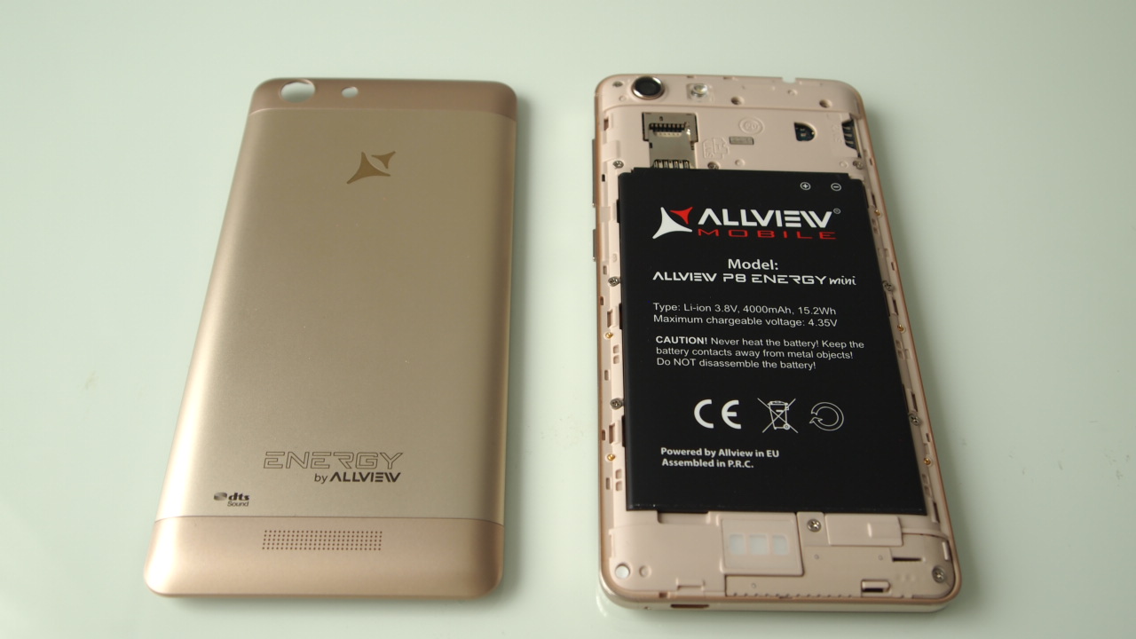 Lateralele fabricate din metal oferă o rezistență la înconvoiere impresionantă, iar impresia lăsată este că Allview P8 Energy Mini este construit temeinic. Spatele telefonului este realizat complet din plastic, unul care imită metalul. Capacul poate părea că se desface fără părțile de sus și jos, de altă nuanță aurie, dar de fapt el formează un întreg cu acestea.