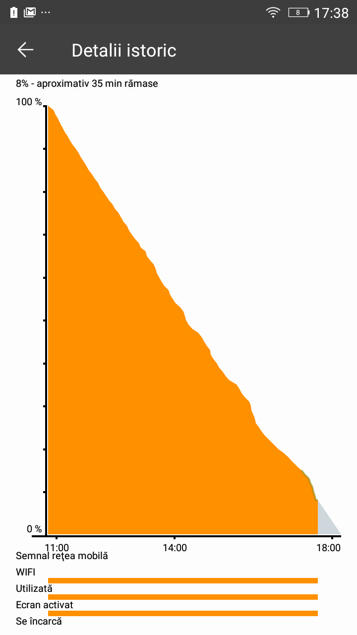 Gata, am ajuns și la capitolul unde Allview P8 Energy Mini ar trebui să impresioneze. Și o face, chiar dacă nu în modul în care mă așteptam. Adică, telefonul te va duce o zi întreagă fără probleme, aș spune oricât l-ai forța. Cu utilizare medie și luminozitatea ecranului setată pe auto sau la circa 50-60%, bateria de 4000 mAh îți poate oferi și peste 2 zile de autonomie.