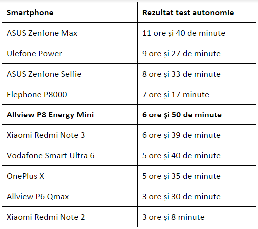 Tabel cu câteva rezultate obținute în testul de autonomie specific Gadget.ro: