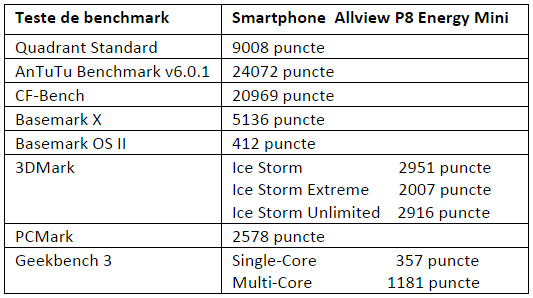 Rezultatele testelor de benchmark prin care a trecut Allview P8 Energy Mini sunt în tabelul de mai jos.