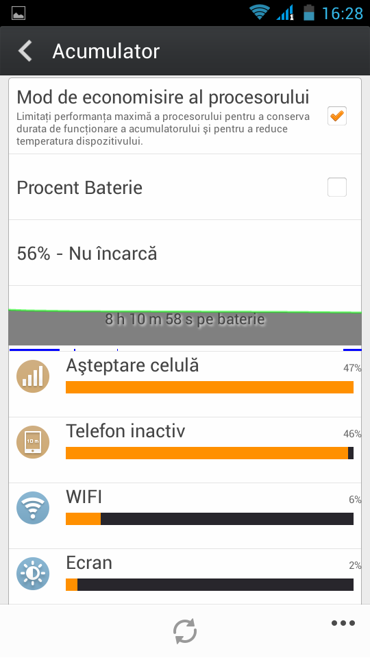 Mi-aș fi dorit să găsesc un acumulator mai mare, dar presupun că era afectat grosimea telefonului. Totuși, îți oferă 1 – 2 zile de autonomie în condiții de utilizare moderate. Îl folosești mai puțin, scoate și mai mult între reîncărcări. Pe folosire mai agresivă, multe jocuri, download de aplicații etc și tot se duce pe la 6 – 7 ore, sincronizări în fundal, fără vreo activare a economizorului implementat, luminozitate la maxim. Cu luminozitate la 50%, fără sincronizări ale conturilor de Google, Facebook etc ajunge fără probleme de dimineața până seara.