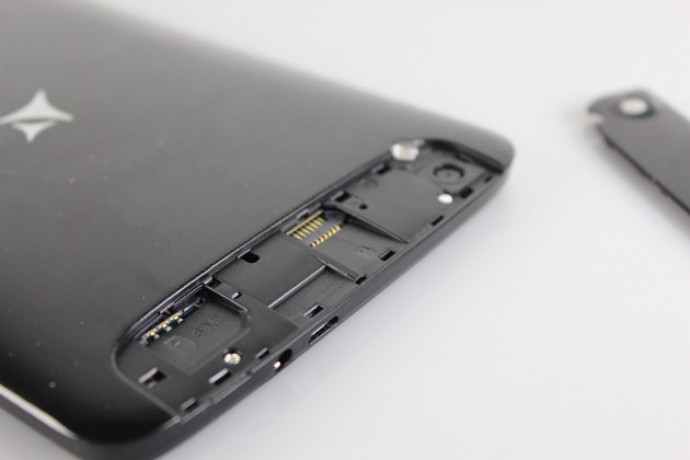 În partea superioară dați de portul microUSB și jack-ul de 3.5 mm, în lateral dreapta de power și reglarea volumului, iar pentru a accesa sloturile pentru SIM și microSD trebuie îndepărata un micuț capac spate ce acoperă și camera de 3.2 Megapixeli.