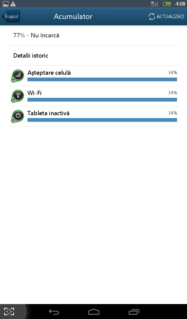 Bateria de 2800 mAh este călcâiul lui Ahile pentru această tabletă. S-ar fi potrivit un acumulator de măcar 4000 – 4500 mAh. Cu display-ul pe luminozitate maximă și cu sincronizările activate în fundal nu am trecut pragul a 2 ore și 30 de minute – 3 ore de utilizare. Este puțin pentru o tabletă cu 3G, o tabletă pe care o folosești la drum lung. Singurul punct PRO ar fi că acumulatorul de 2800 mAh se încarcă repede și o baterie auxiliară ajută mult pe partea de autonomie.