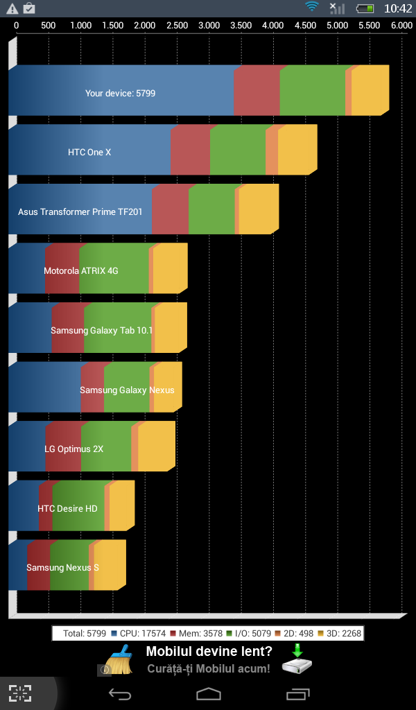 | Vellamo | Browser – 1783 puncte;Multi-core – 1199 puncte;