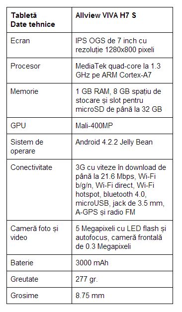 Elemente de bază pentru Allview VIVA H7 S: MediaTek quad-core la 1.3 GHz pe ARM Cortex-A7 + 1 GB RAM + Mali-400MP accelerator grafic, 8 GB spațiu de stocare din care în jur de 5 GB în mod real și slot pentru microSD de până la 32 GB.