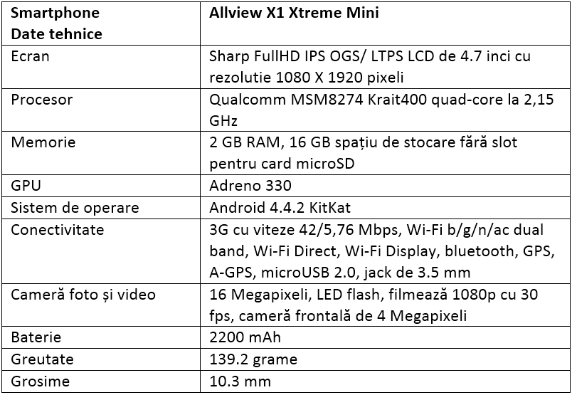 Allview X1 Xtreme Mini este un smartphone single sim ce oferă viteze 3G de 42 Mbps în download și 5.76 Mbps în upload. Mai dispune de Wi-Fi 802.11 b/g/n/ac dual band, Wi-Fi Direct, Wi-Fi Display, bluetooth 4.0, GPS cu A-GPS, microUSB 2.0, jack de 3.5 mm.