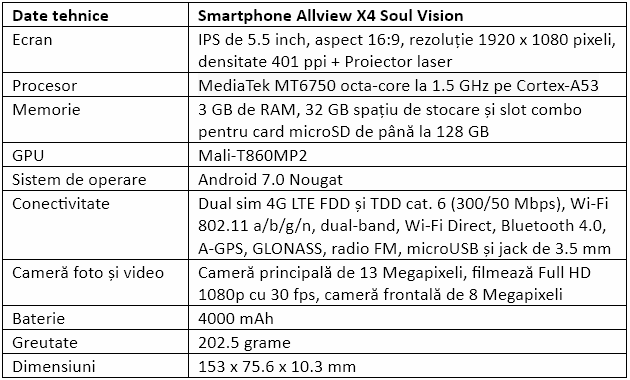 În cutia de retail, Allview X4 Soul Vision ajunge la client alături de o gamă completă de accesorii. Pe lângă nelipsitul încărcător pe USB și cablu microUSB – USB 2.0, mai găsim și căști in-ear pe fir lat cu două perechi suplimentare de dopuri, husă de protecție din plastic rigid, folie de protecție pentru ecran, un suport micuț util atunci când folosim proiectorul, agrafă pentru accesul către sloturile sim, manual de utilizare și certificat de garanție.