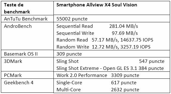 Allview X4 Soul Vision a trecut și prin câteva teste de benchmark, iar rezultatele le puteți vedea în tabel: