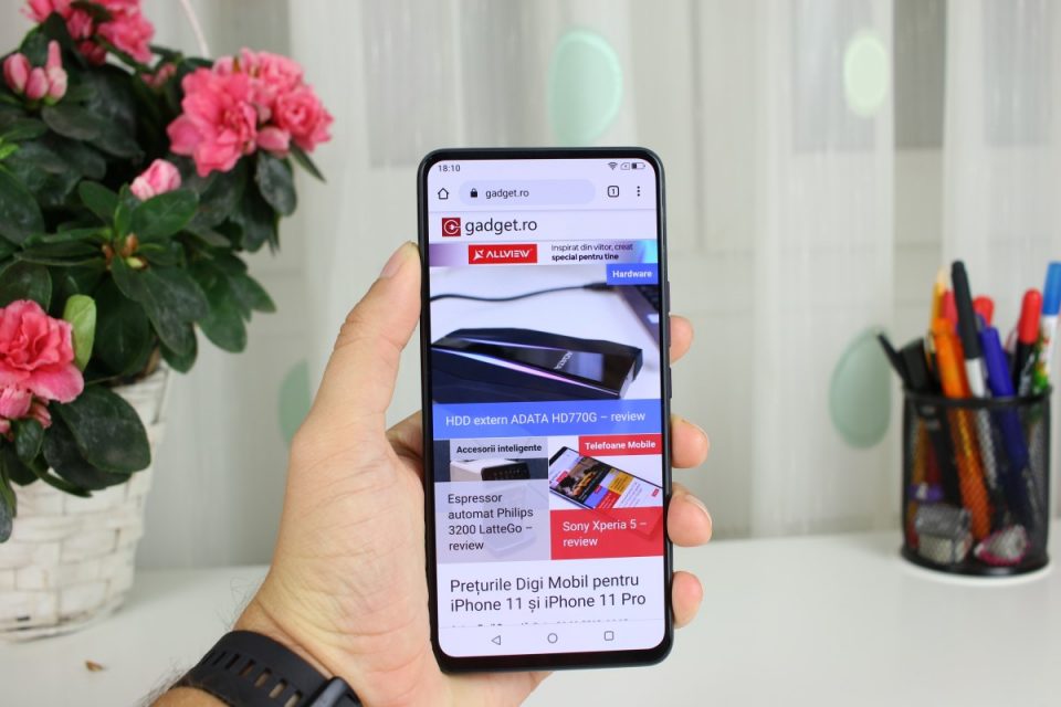 AMOLED de 6.39 inch cu rezoluție FHD+ / 2340×1080 pixeli, aspect 19.5:9 și raport display / corp de 85.9%. Au folosit Corning Gorilla Glass 5 spre a proteja ecranul, iar din pachet sosește și cu folie de plastic aplicată. Trebuie să fiți puțin atenți când o îndepărtați, eu am reușit să o ridic cu totul. Presupun că folosind folia din pachet nu este afectat cititorul de amprentă optic integrat în ecran.