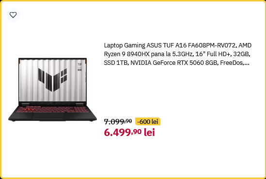 - laptop de gaming ASUS TUF A16 FA608PM-RV072 cu ecran de 16 inci, 32 GB RAM, 1 TB SSD şi AMD Ryzen 8940HX – 6499.90 lei;
